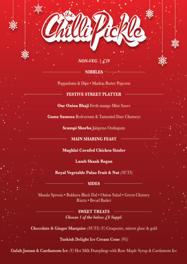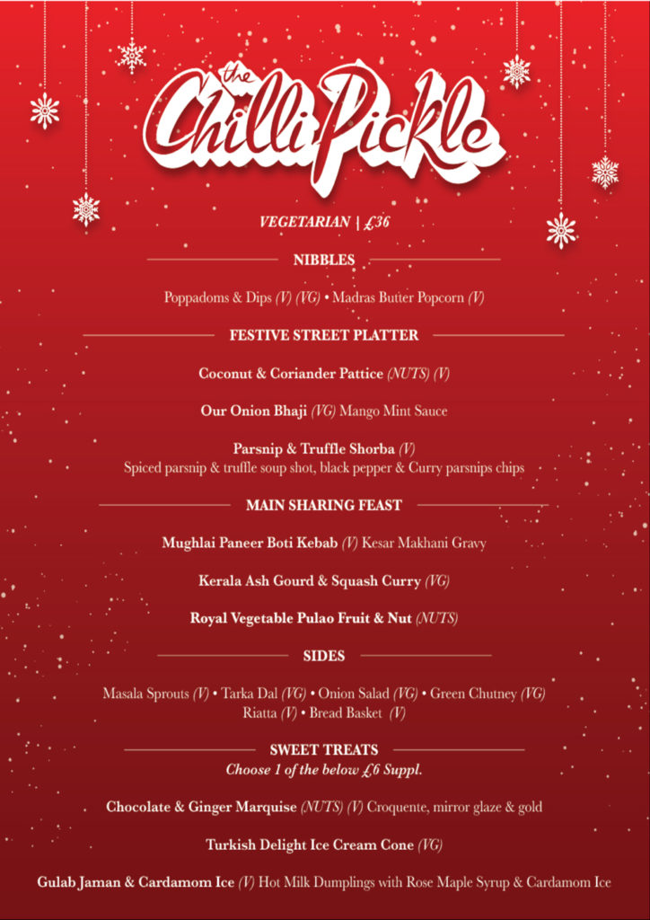 Book your Christmas Feast at The Chilli Pickle this December Simply choose your Veg or Non Veg Menu and we will do the rest with a selection of street food and mains for all to share. Big flavoured Chillipickle food with festive flourishes. For enquiries email bookings@thechillipickle.com or call 01273 442893 We can accommodate up to 80 covers From December 1st – 31st Minimum 2 persons sharing each menu Download Festive Menu For bookings over 6 people please email bookings@thechillipickle.com or use our enquiry form